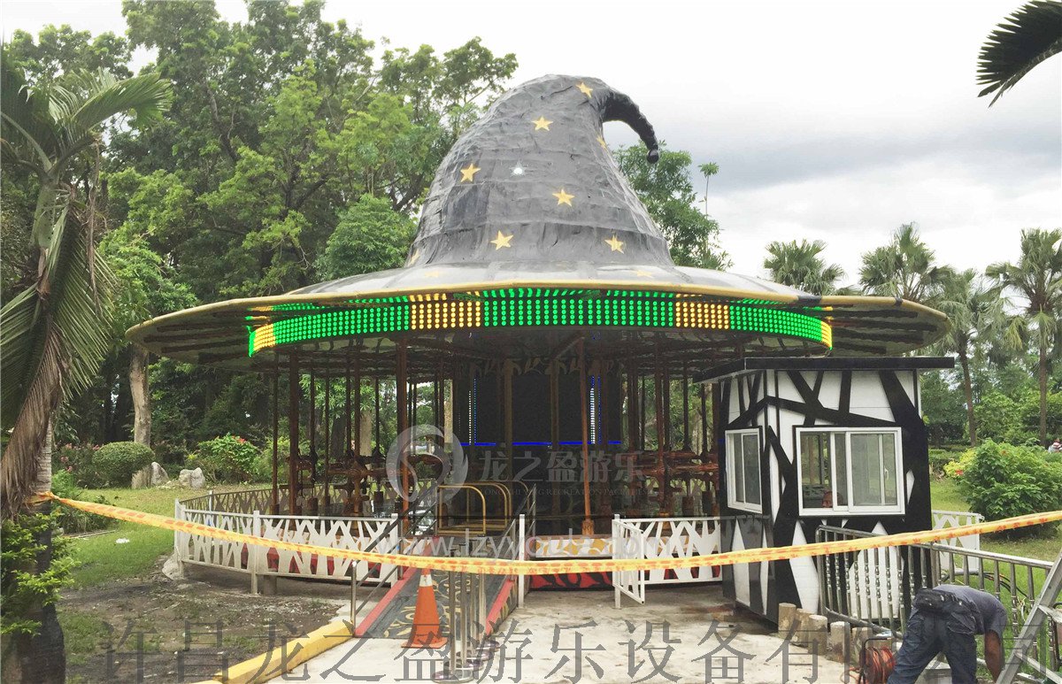 龍之盈游樂設備生產的新型豪華轉馬—飛天魔帽就充分的放飛了這個幻想,該產品結合著名電影《哈利·波特》元素,設備整體是一個巨型的巫師帽,搭配中央顯示屏,結合天幕與地景,以及奇幻的煙霧、泡泡等特效,提供白天到黑夜的神奇魔法飛行體驗,結合現代科技所設計的身臨其境5D呈現的產品。